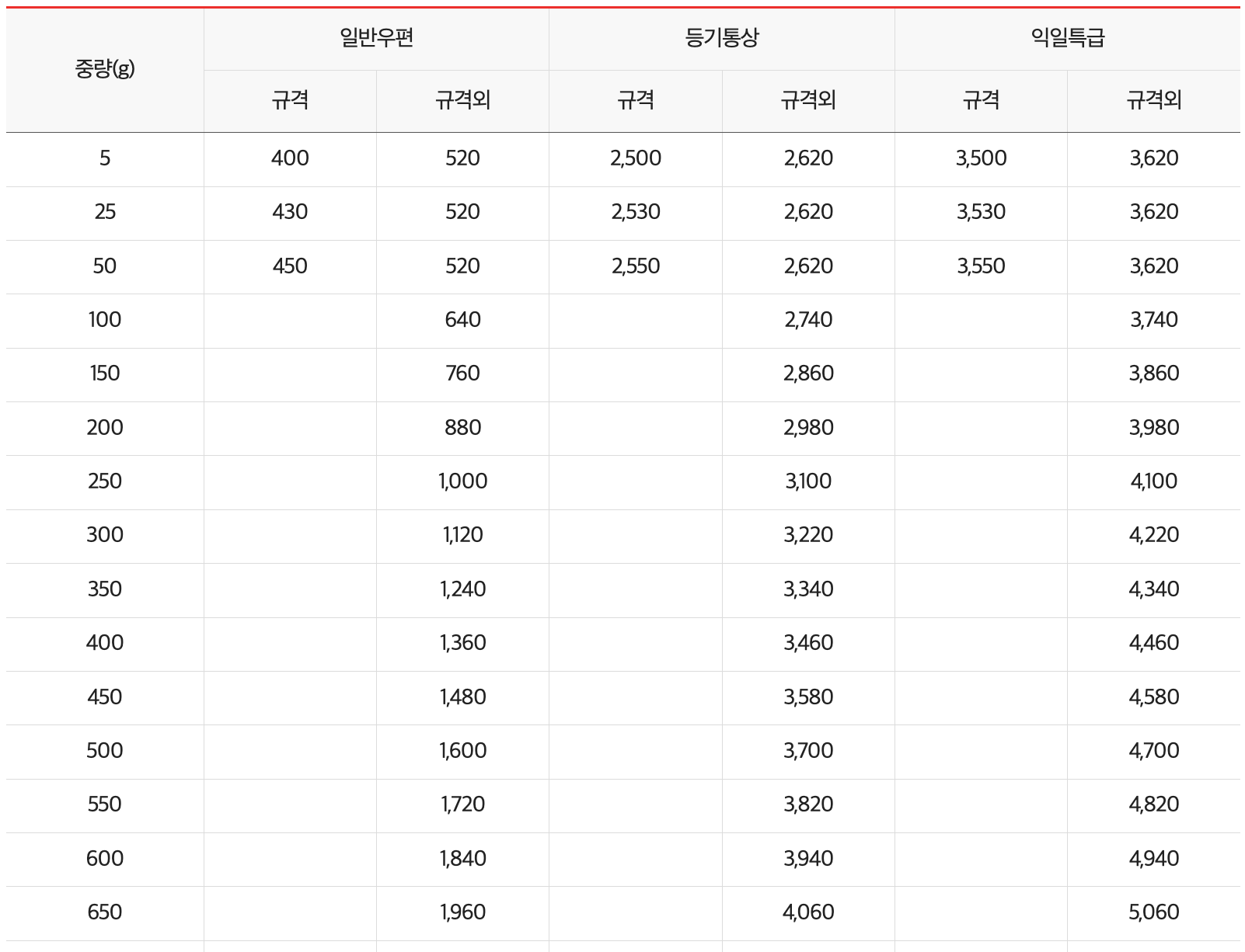 우체국에서 제공하는 우편요금 정보는 아래와 같습니다. 통상우편물의 경우 규격우편물과 규격 외 우편물로 구분되어 있습니다. 같은 중량이라고 하더라도 일반우편 / 등기통상 / 익일특급에 따라 가격이 나뉘어 있습니다. 익일특급의 경우 우체국에 따라 마감시간이 다르거나 취급하지 않을 수도 있기 때문에 미리 방문하고자 하는 우체국에 확인하신 후 방문하시는 것을 추천드립니다.