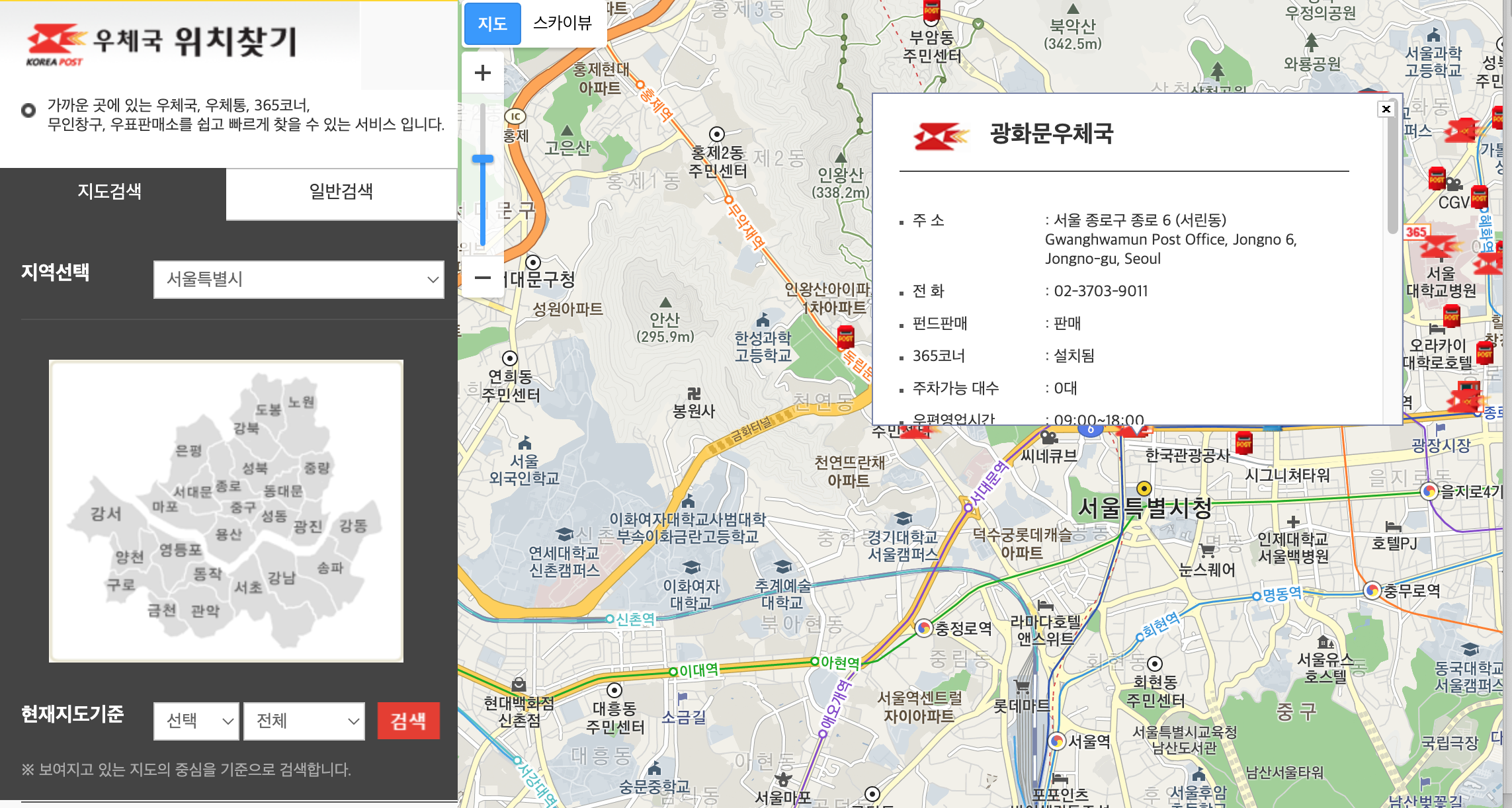 - 우체국 내부에 위치한 경우: 월-금 오전 9:00 ~ 18:00 / 공휴일 X
