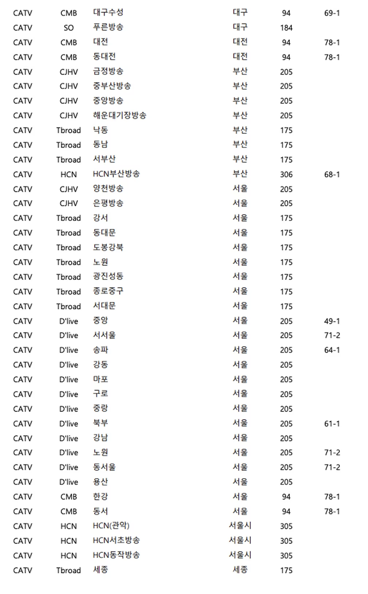 카툰 네트워크와 부메랑은 지역과 방송사에 따라 채널번호가 각각 다릅니다. 홈페이지에 들어가시면 쉽게 확인 가능하지만 편의를 위해 아래와 같이 채널번호를 제공하고 있습니다.