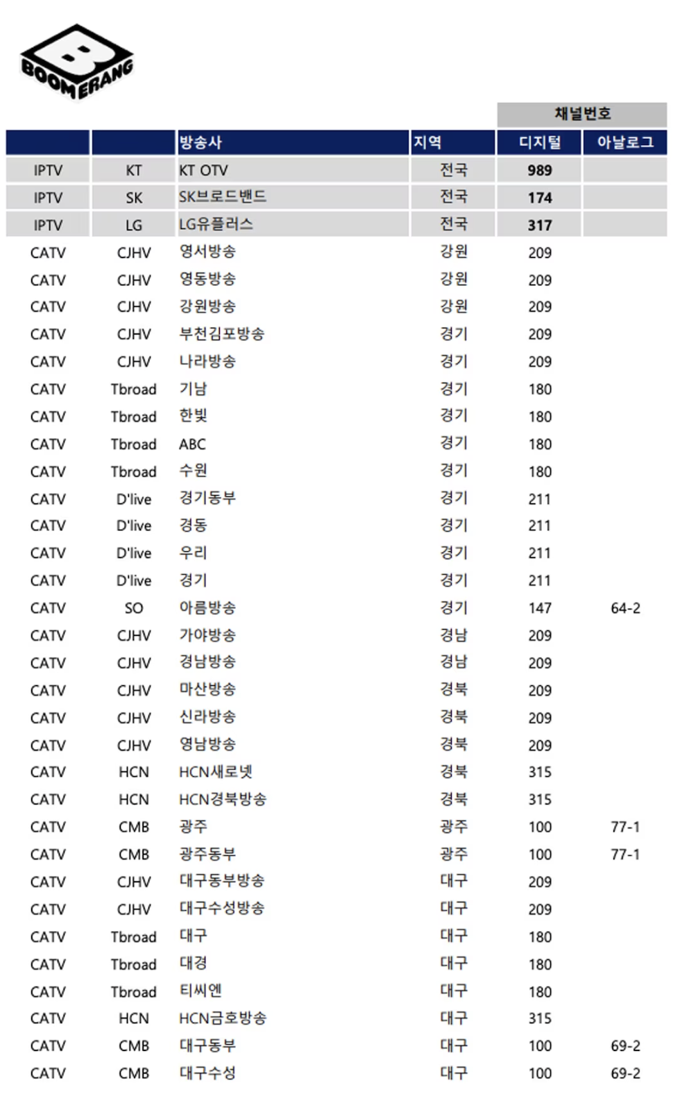 카툰 네트워크와 부메랑은 지역과 방송사에 따라 채널번호가 각각 다릅니다. 홈페이지에 들어가시면 쉽게 확인 가능하지만 편의를 위해 아래와 같이 채널번호를 제공하고 있습니다.