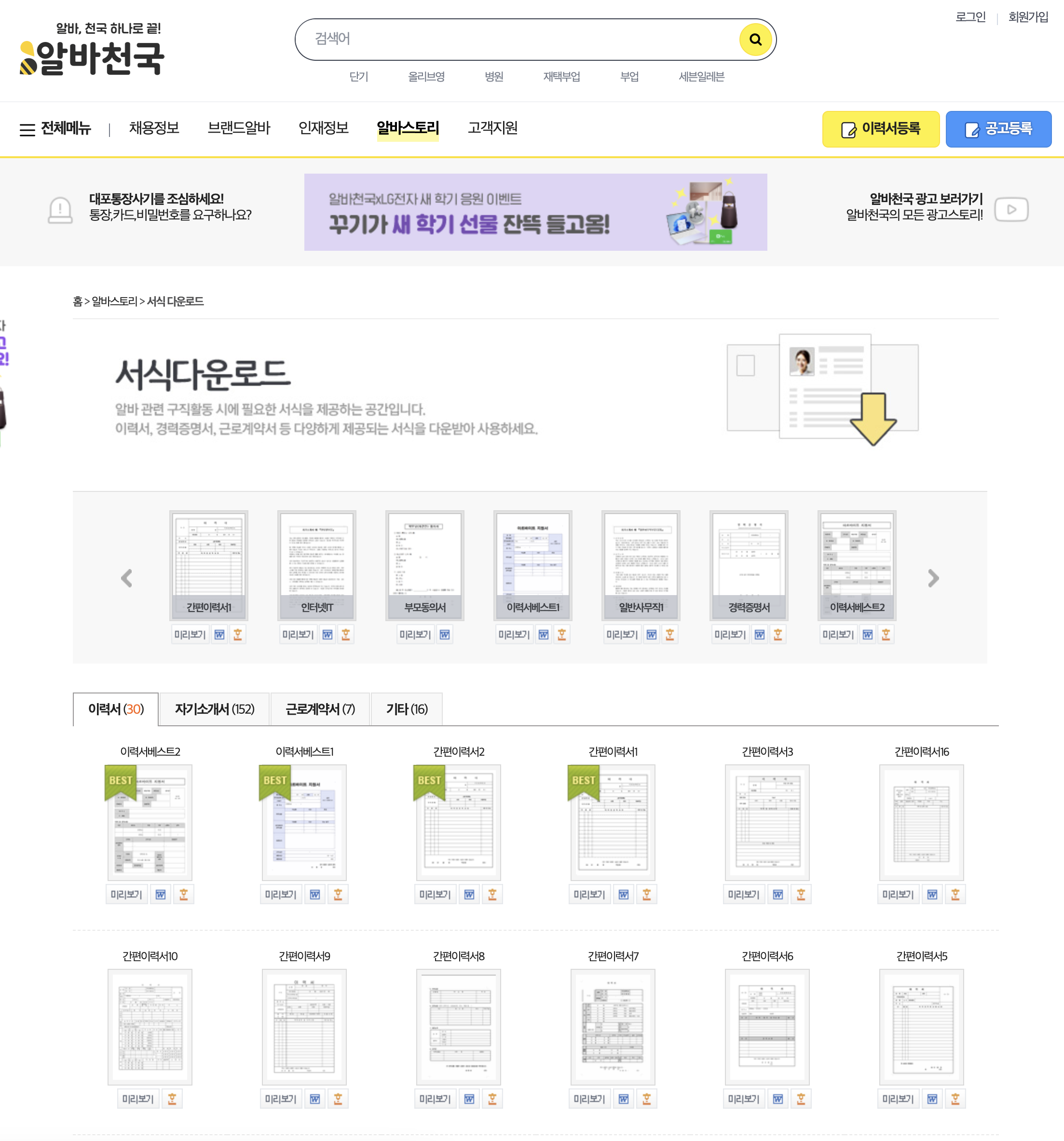 알바천국에서는 간편이력서부터 일반 사무직이나 각종 직군에 맞는 이력서를 제공하고 있으므로 각자에게 맞는 이력서를 다운로드하여 사용하시면 됩니다.