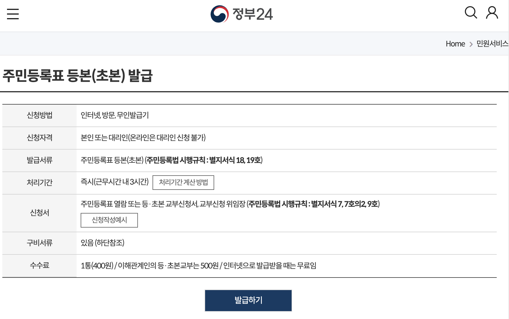 주민등록등본 또는 주민등록초본은 정부24에서 쉽게 발급이 가능합니다. 집에서 프린트하실 경우라면 온라인으로 쉽게 받으실 수 있고, 휴대폰으로도 주민등록등본을 발급받으실 수 있습니다.