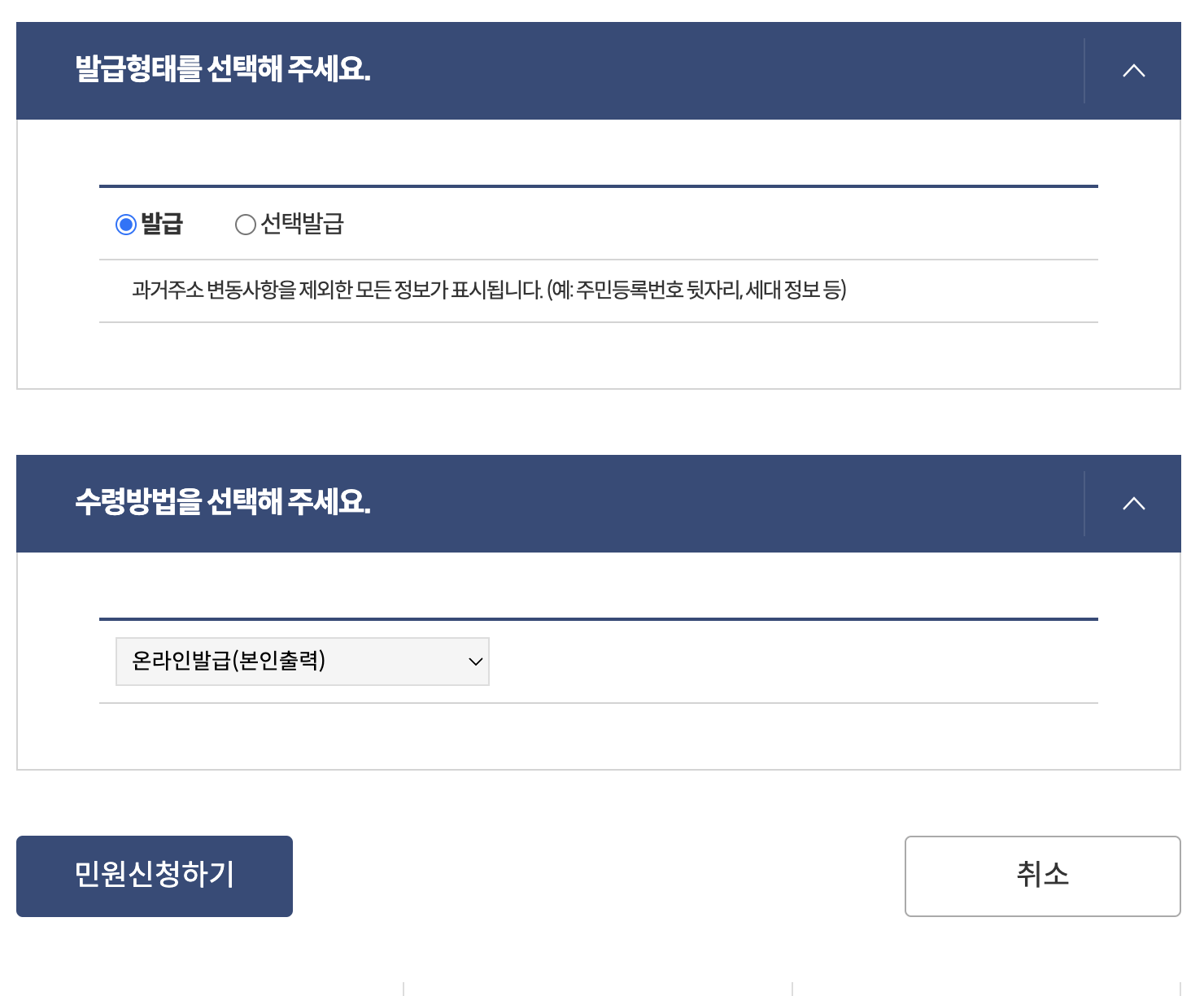 ✔️ 발급 선택시 | 과거주소 변동만 제외