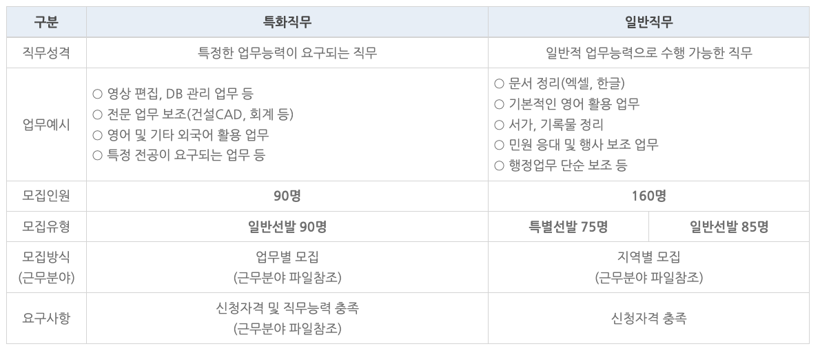 서울시에서 제공하는 대학생 겨울방학 아르바이트는 총 250명을 선발하며 특화선발과 일반선발로 나뉘어져 있습니다. 선발유형은 직무에 따라 아래와 같이 나뉘어집니다.