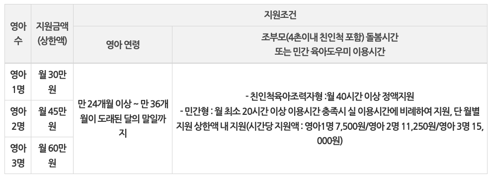 만 24개월 이상 ~ 만 36개월 영아까지 지원을 받을 수 있으며 지원금액과 조건은 위와 같습니다. 어린이집을 이용하는 경우라면 기존의 보육시간(9시 ~ 16시)은 돌봄시간(월 40시간) 산정에서 제외됩니다. 또한, 정부지원 아이돌봄 서비스와 중복 이용하는 경우라면 해당 월의 돌봄비를 지원하지 않습니다.