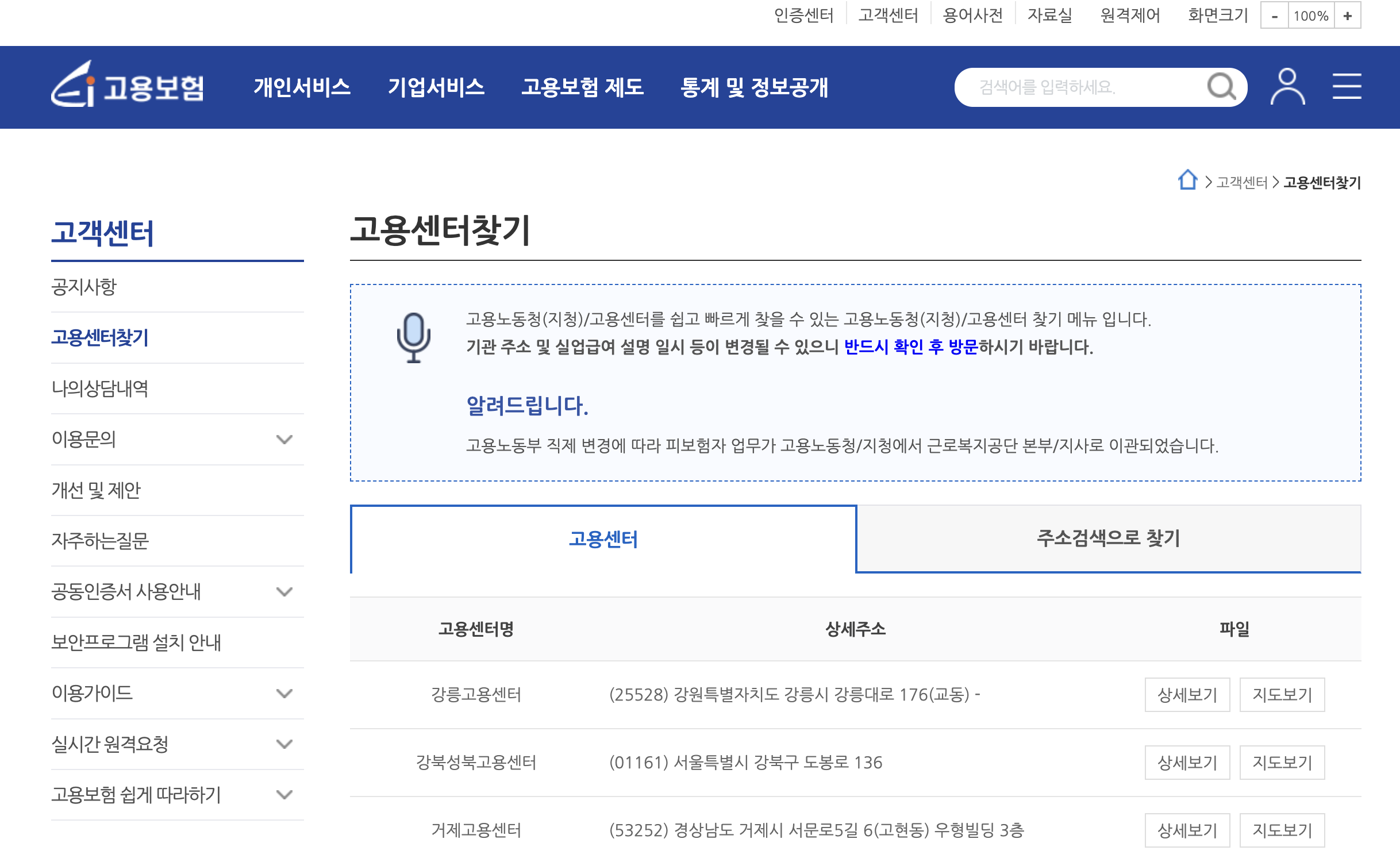 • 오른쪽 하단 관할고용센터 확인