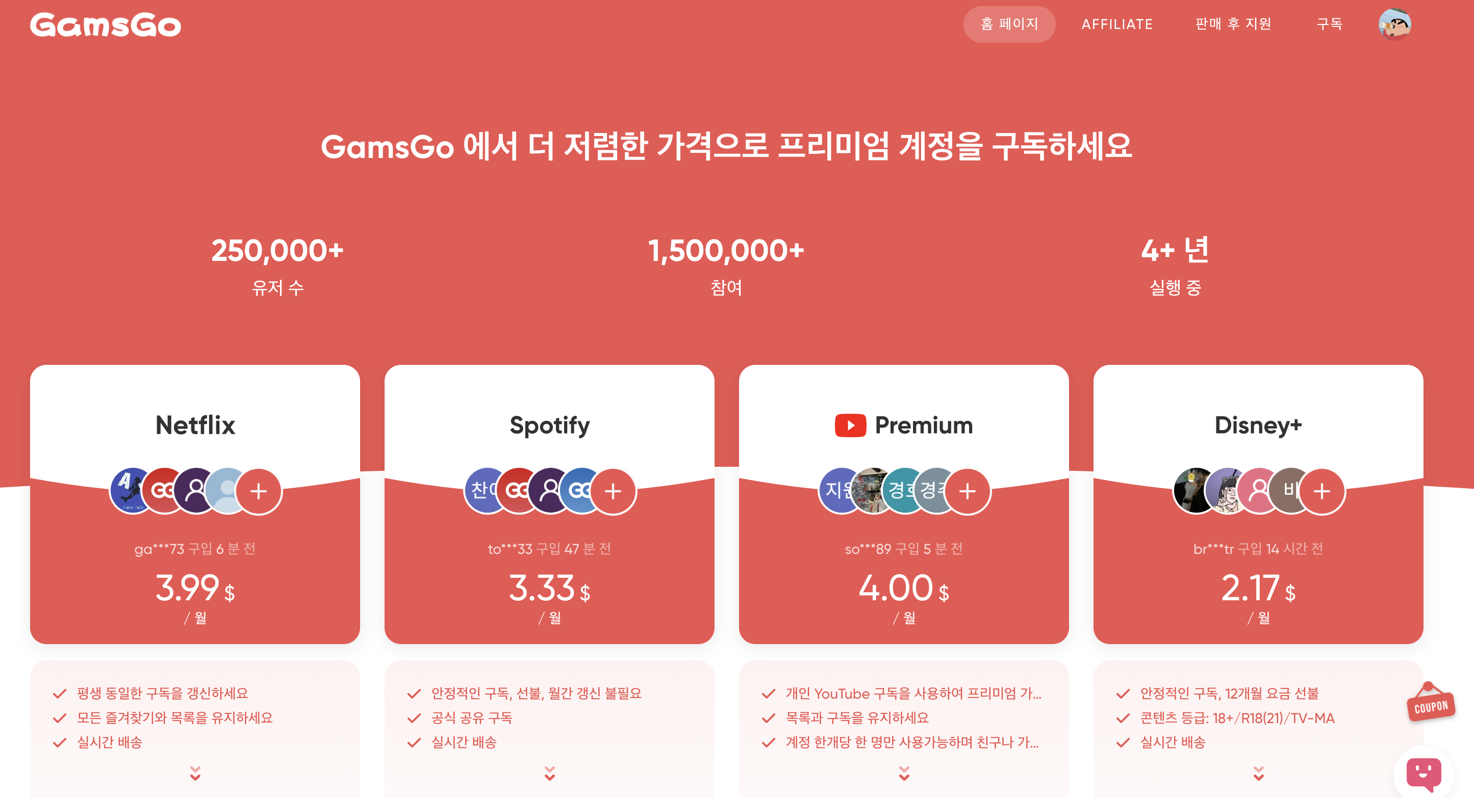 바로 겜스고와 같은 플렛폼을 이용하는 것인데요. 겜스고는 스포티파이 뿐만 아니라 넷플릭스나 유튜브 프리미엄, 디즈니와 같은 OTT 서비스까지 저렴한 가격에 구독할 수 있습니다. 겜스고를 할인받는 경우, 스포티파이 가격은 1년에 23.77달러로 월 1,98달러(약 2,500원)에 스포티파이를 구독하실 수 있습니다.
