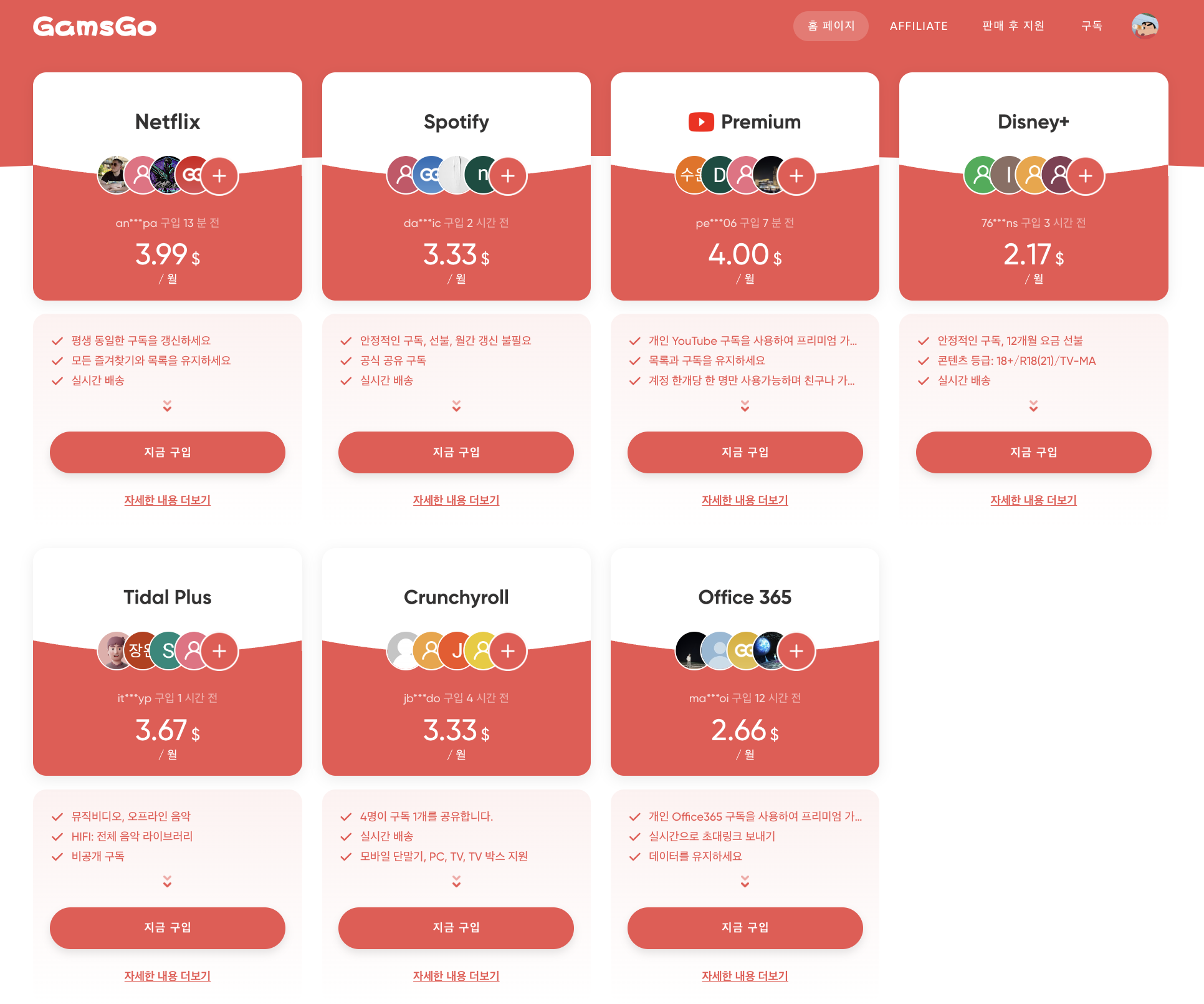 겜스고는 전 세계 25만명이 이용하고 있는 공유 사이트월 4천원대에 유튜브 프리미엄 & 뮤직을 사용할 수 있을 뿐만 아니라 넷플릭스나 디즈니플러스도 할인된 가격으로 구독을 할 수 있습니다.