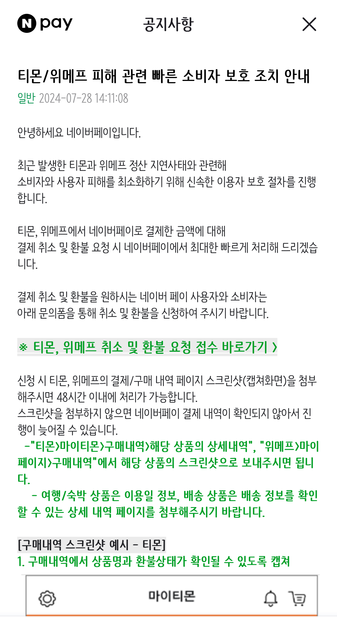 - 카카오톡 어플: 더보기 - 카카오페이 - 전체 - 고객센터 - 티몬/위메프 취소신청