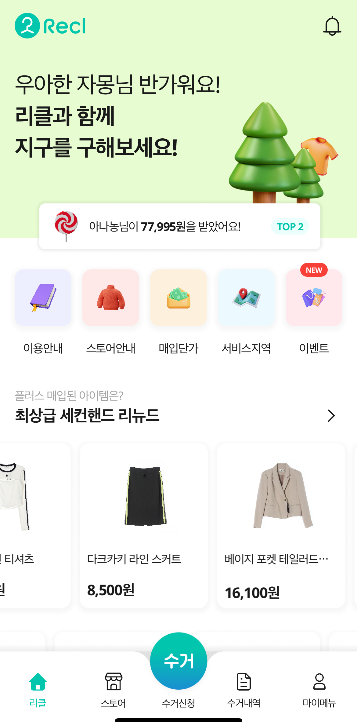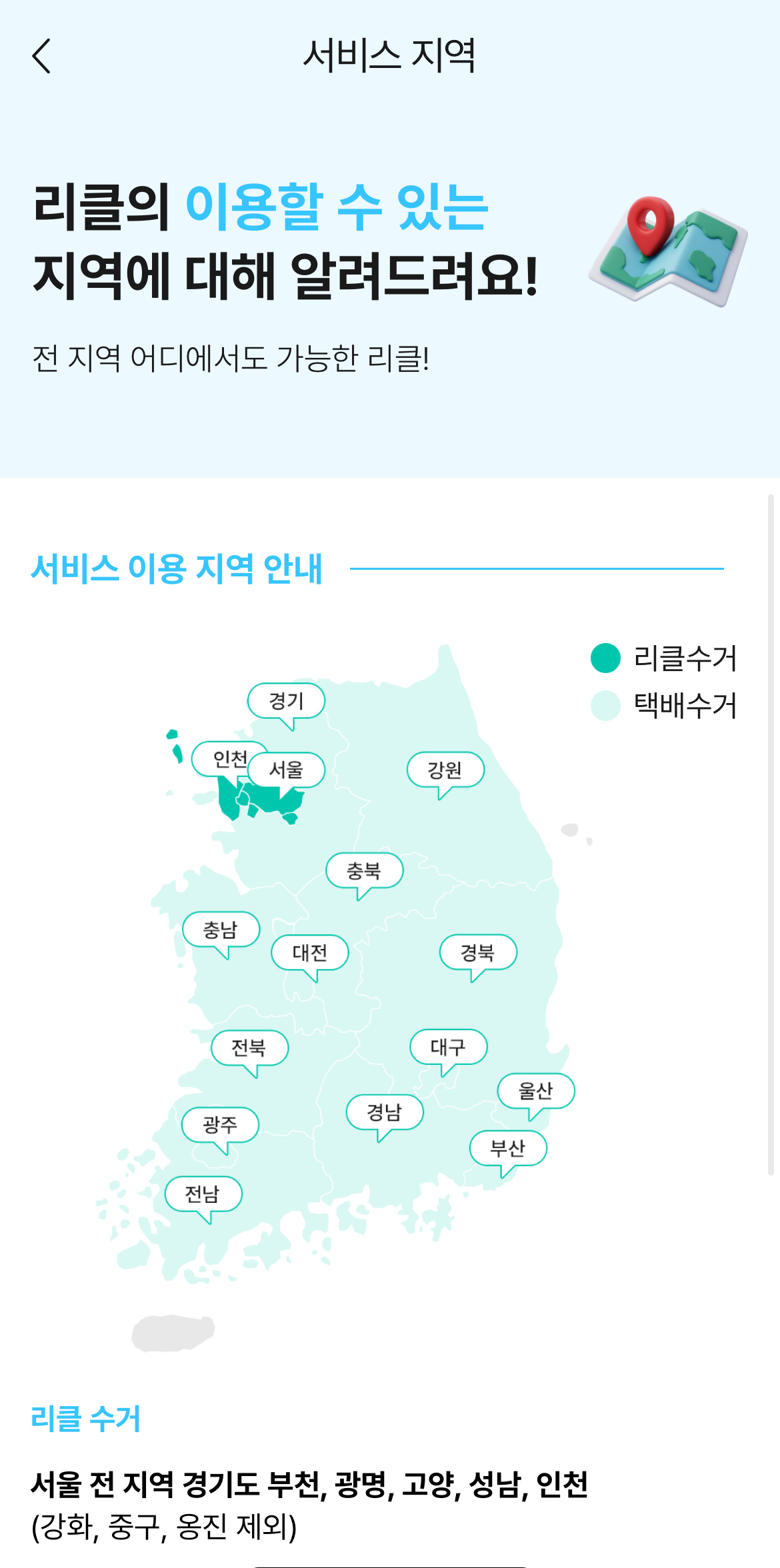 헌옷방문수거 서비스를 제공하는 리클은 어플을 다운로드 받은 후, 하단의 수거 버튼을 눌러 수거예약을 할 수 있습니다. 서비스 이용지역은 전국이나 리클이 직접 수거하는 서비스는 다음과 같습니다.
