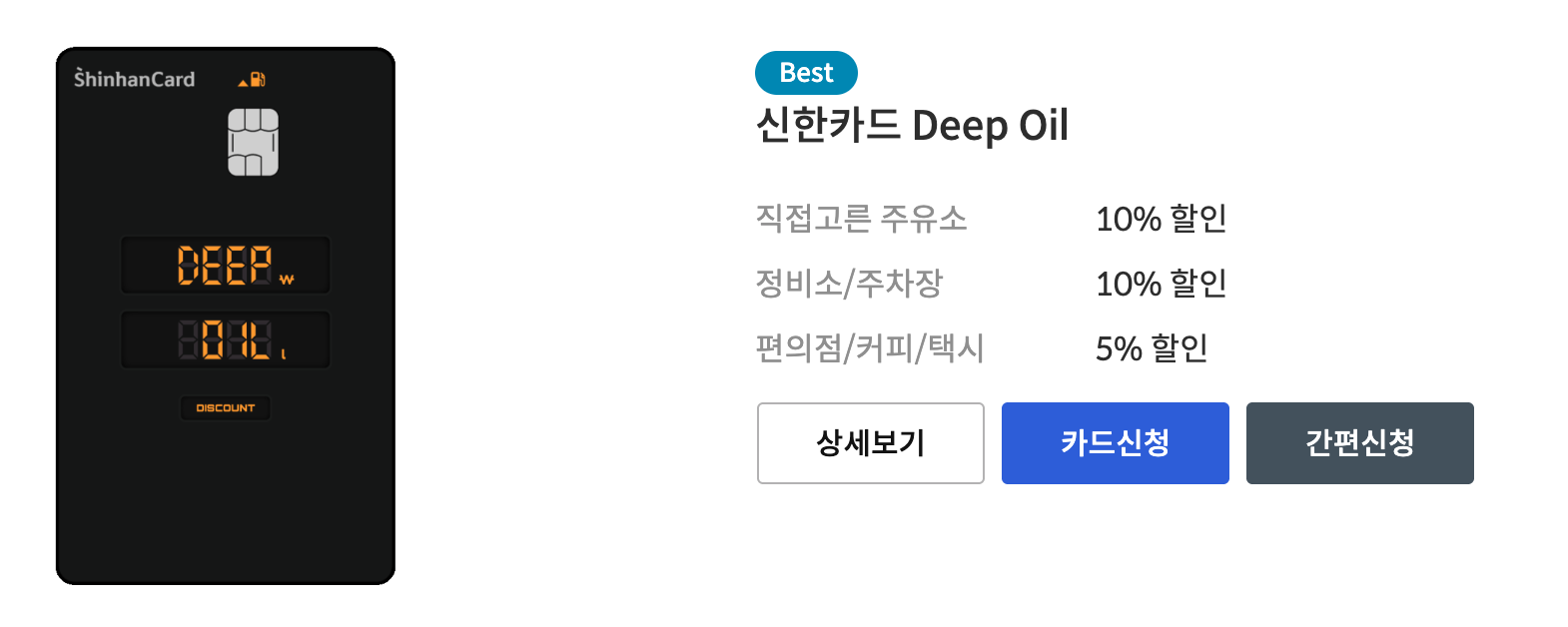 주유비를 아끼기 위해선 신용카드나 간편결제의 혜택을 이용하는 것도 좋은 방법입니다. 2025년 현재 인기 있는 주유 할인 카드로는 신한 딥오일 카드 삼성 iD ON 카드가 있습니다.