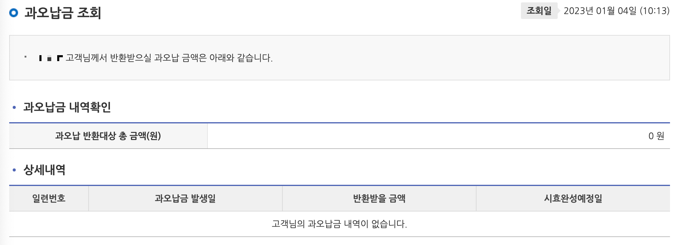 아쉽게도 저는 과오납금이 없네요. 과오납금은 말 그대로 국민연금을 더 내거나 잘못 냈을 경우를 말하는데, 조회 후 과오납금이 있을 경우 납부일로부터 5년 이내에 환급신청을 통해 돌려받으실 수 있습니다.