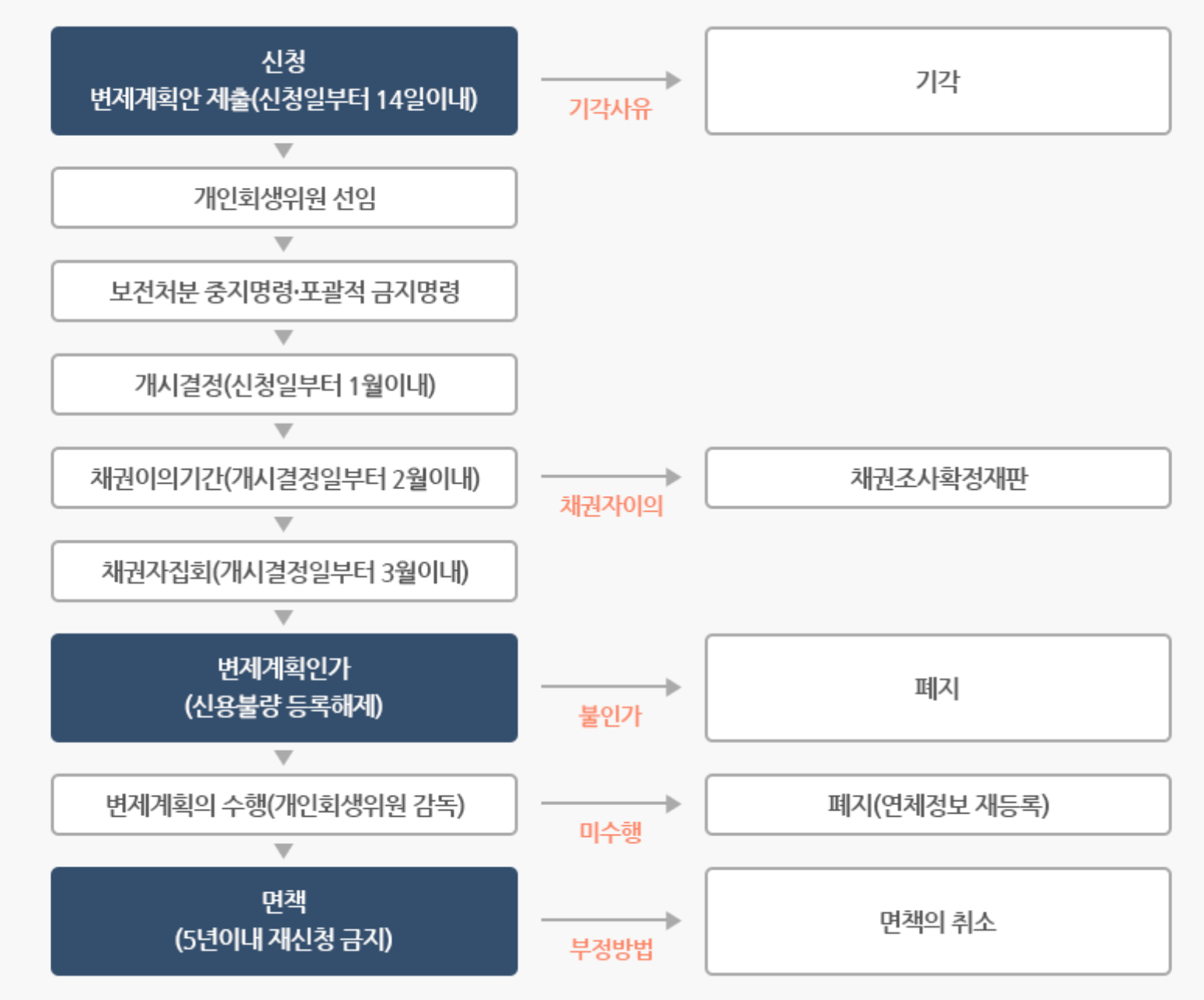 앞서 언급한 바와 같이 개인회생제도란 어떤 사유로 인해 재정적으로 어려움을 겪고 있어 파산 직전에 있는 개인 채무자이고 장래 계속적으로 수입을 얻을 가능성이 있는 자에 대하여 이해관계인의 법률곤계를 조정해 줌으로써 채무자가 효율적으로 회생하고 채권자는 채권을 회수할 수 있도록 하기 위해 마련된 절차입니다. 이는 2004년 9월 23일부터 시행하게 되었는데, 총채무액이 무담보채무의 경우 10억, 담보보채무의 경우에는 15억 이하인 개인채무자가 3년간(채무자 회생 및 파산에 관한 법률 제611조 제5항 단서의 경우 5년) 일정 금액을 변제하면 나머지 채무를 면제받을 수 있는 것이죠.