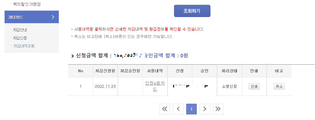 신청하시고 나면 이렇게 기타 카드 - 차감내역 조회에서 신청금액을 확인하실 수 있습니다. 저는 오늘 생각난 김에 한번 해 보았는데, 남은 복지포인트를 모두 신청해보았습니다.